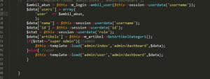 Di kode diatas, saya mengambil data role (hak akses) dari session login yang aktif, dan menyimpannya dalam variabel $stat. Kemudian saya melakukan perandaian dengan if, jika data dalam variabel $stat sama dengan “super admin” maka yang tampil adalah halaman index untuk admin, dan jika tidak maka yang tampil halaman lain.